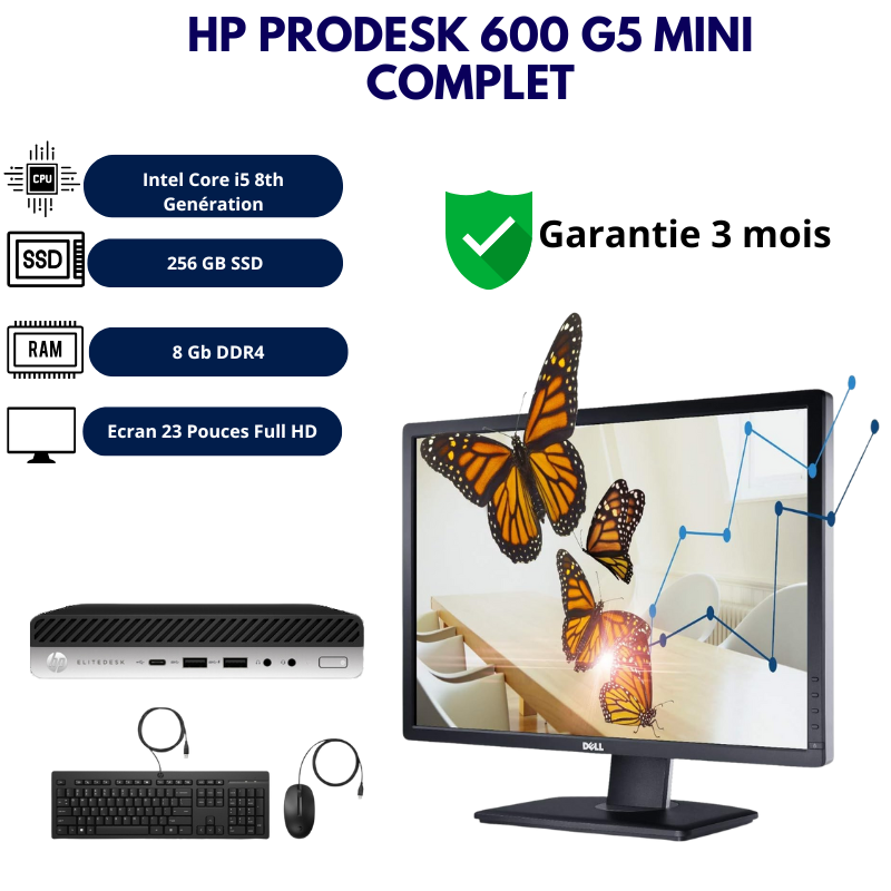 Le Pack complet HP ELITEDESK 800 G3 MINI est une solution prête à l’emploi pensée pour les entreprises, les administrations, les travailleurs à domicile et les professionnels nécessitant un ordinateur pour bureau fiable, compact et performant. Ce pack associe une unité centrale HP ELITEDESK 800 G3 au format mini — équipée d’un processeur Intel Core i5 de 8ᵉ génération, 8 Go de mémoire vive (RAM) et un SSD de 256 Go — à un écran Dell 23 pouces Full HD, offrant un poste de travail complet, ergonomique et professionnel. Le HP ELITEDESK 800 G3 est reconnu pour sa robustesse, sa sécurité renforcée et sa capacité à s’intégrer dans des environnements de productivité exigeants.